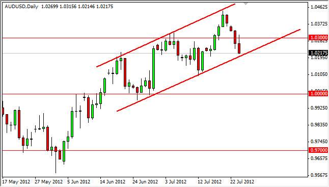 On the chart attached to this article, you will see that there is an up trending channel that looks pretty obvious on this latest rally. The Tuesday candle not only trying to rally above the 1.03 level, but it turned around and is closing at the absolute lows for the day. It also happens to be sitting on this uptrend line, and if that gives way - I fully believe this pair will crumble back down to the parity level. In fact, it would not surprise me if the daily candle which by my broker will be closed in two hours, ends up closing below this line.