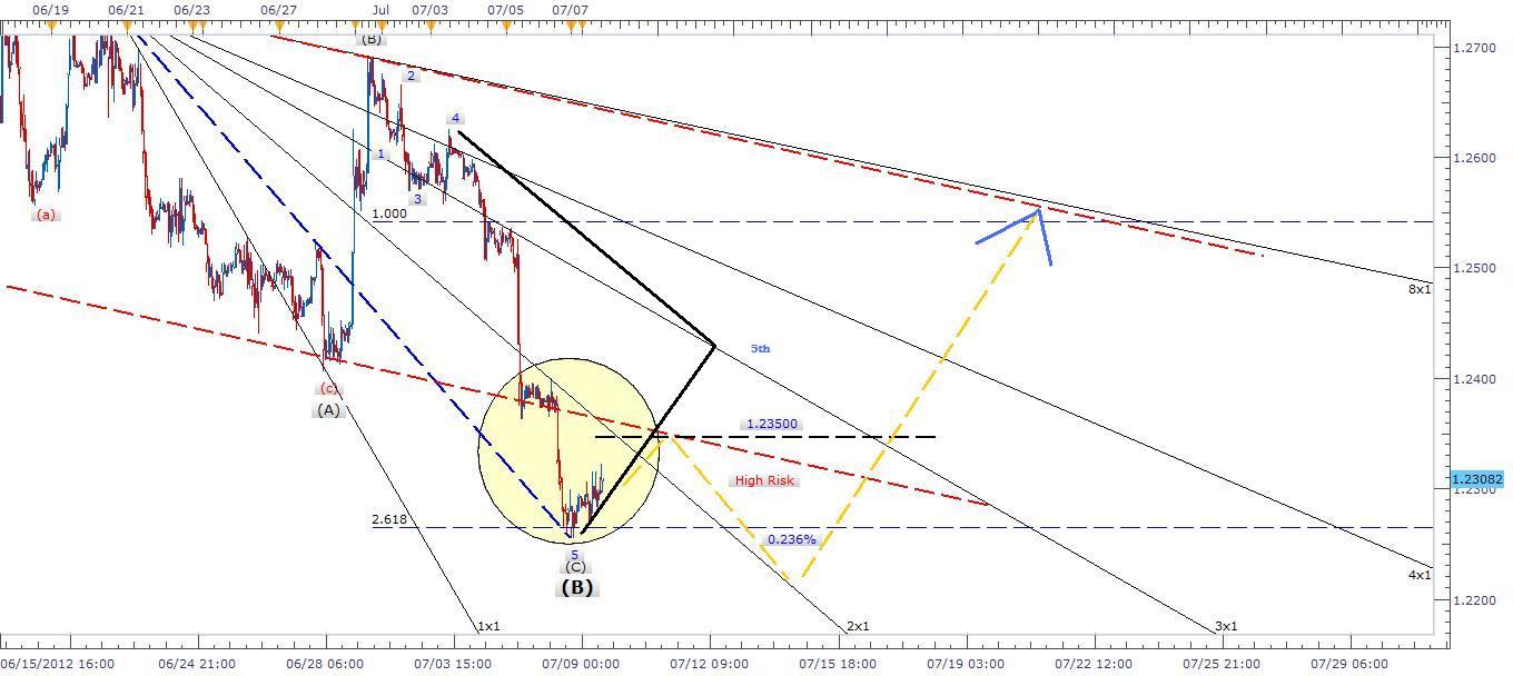 Description: My apology for the messy chart! However, in terms of a technical view, I see expanded fifth wave in C leg in a falling Zigzag that broke below falling channel (Red Line) reaching 2.618 Fibonacci level. In zone below the read dotted line is a very high risk area for trading although we see a positive divergence in RSI H1 (Not shown). I used Gann fan to spot falling resistance levels which they look extreme. We need to consider here the behavior of trend and expected pattern follows expanded 5th wave, which I expect an expanded flat that could follow yellow pattern (Look at Chart) hitting red line then falling below minimum level in proximate 0.236% below point (c) and then up in a motive wave that could reach 1.2600 price point. It is too early to talk about the expected target level, but I would suggest traders to keep their eyes open to buy and hold above 1.23500 level to reduce risk and increase probability. I will stay aside and post a follow up just when price move at or above 1.23500.
