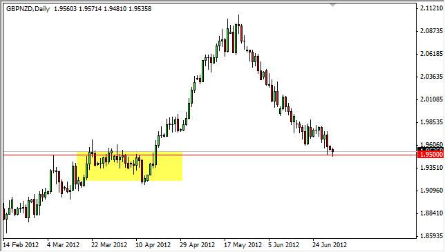 While I don't know necessarily that this is going to be the move of a lifetime, this certainly looks like it setting up for a nice 300 pip run or so. Because of the candle formation and more importantly the location, I am willing to take a flyer in this pair and buy it on a break above the Monday highs. I would be willing to take profit at 1.9855 or so, even though it is somewhat countertrend. It should be said however, if that level gives way - this pair could rocket straight back to the 2.00 level and beyond.