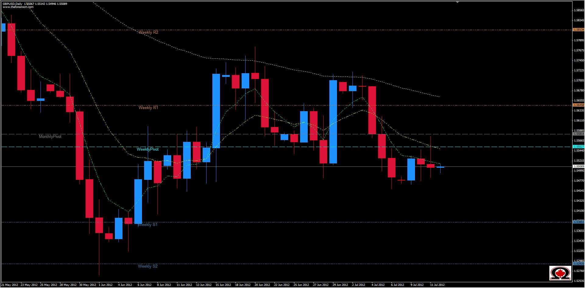 The GBP/USD attempted to break higher in yesterday's trading, topping out at 1.5577 and piercing the Weekly Pivot at 1.5553 The pair failed to reach the Monthly Pivot by only 5pips due to previous daily closes lining up as resistance at 1.5564. Although the pair is not part of the struggling European Union, the overall economic state of the EU weighs on the British Currency like an anchor at times. The pair has been trying to gain some bullish momentum as evidenced by the rate of fall of the EUR/USD in comparison, or at least slow the descent but has been unsuccessful. With the rejection of the higher prices, we can now expect a break lower with the most likely target being 1.5400 Support can be found at 1.5470 & 1.5430 on the way down with resistance above at 1.5524 and 1.5560. I am bearish on this pair as long as price is below 1.5570.
