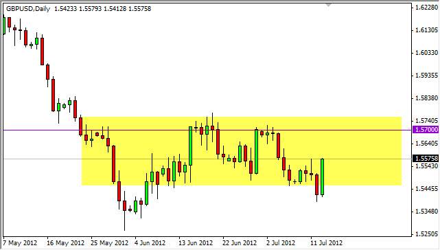 With the candle looking so strong, it makes sense that we will attempt to reach the top of the recent consolidation area. Once we broke down the 1.55 level, I admit that I thought we were going to fall at that point. Of course, false breakouts happen from time to time, and this is definitely a prime example of one. Nonetheless, I don't see any catalyst at this point is the drive this pair above the resistance level that is formed at the 1.57 and 1.58 handles.