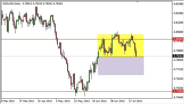 In a great representation of how all markets have been tied together lately, one of the things that really got this pair trying to break down below the previous consolidation support level was the release of Apple numbers for the previous quarter. Since the company is considered a barometer of global growth, as the Asians and the other emerging markets are jumping on the bandwagon, the fact that the company missed across-the-board with all metrics on the conference call suggest that the slowdown around the world is accelerating. Because of this one would have to think that commodities would fall out of that as well, and this of course will sell off the Kiwi itself.