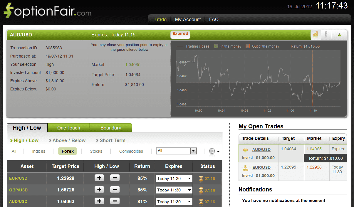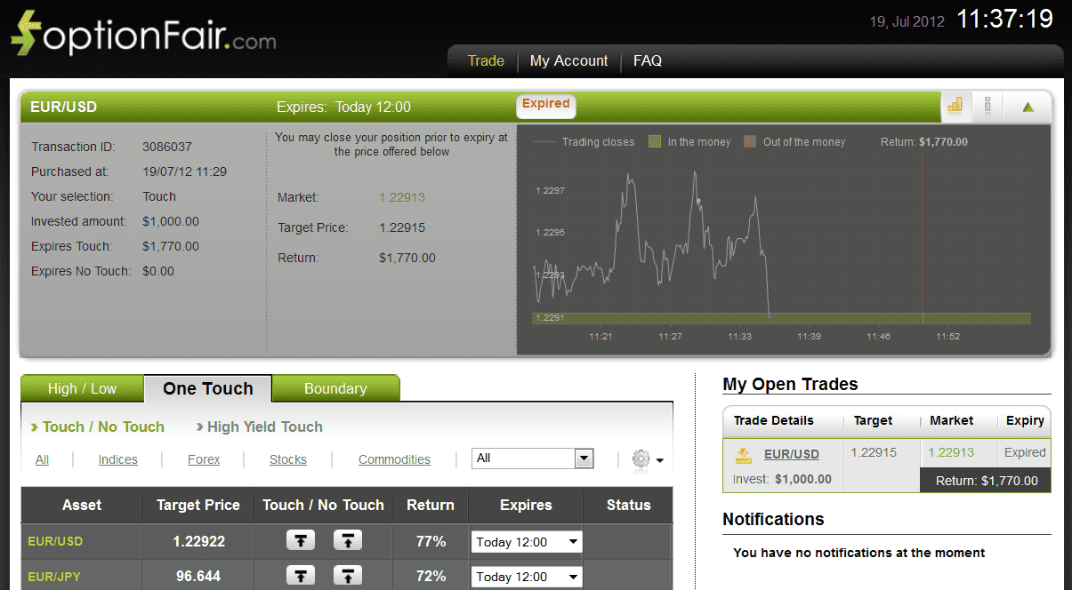 With optionFair™ Binary Options Trading Platform, I traded $1,000 on the “Touch” instrument. This kind of option has a return of 77% if the option doesn’t touch the strike price prior to the expiry.