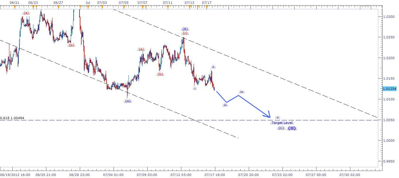 Description: Trading with the crowd, Loonie has formed a double Zigzag after the first one failed to reach the target at 0.618 Fib level (1.0050)price point of wave (I). Waves (A)(B) has been completed and wave (C) with its minor waves iii & iv are still on progress toward expected target level. A break in support level at 1.01335 confirms the bearish outlook for the short term. However, I do suggest traders to sell a small lots at this level due to its risk level and complexity.