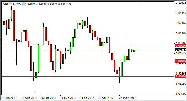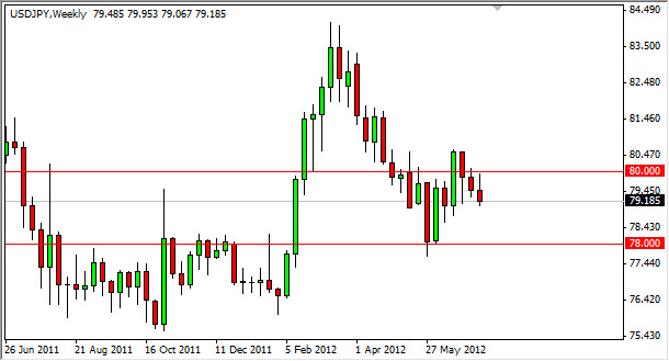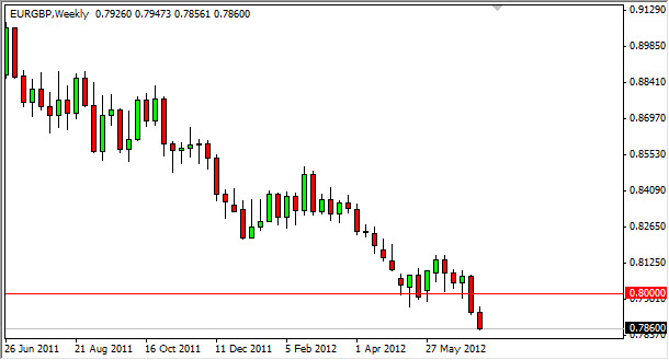 The USD/JPY pair did very little during the week, as it tightens off its range to within 100 pips. The 80 handle above is obviously resistive at this point, and the 79 handle below is obviously supportive. The Bank of Japan has clandestinely intervened in this market previously, and as such I suspect that the79 area is where they are doing it now. This is probably predicated upon the fact that they expanded their asset purchase program by 10 trillion Yen, only to see this pair fall the very next day.