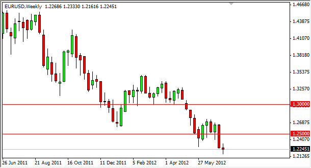The EUR/USD pair had a relatively benign week was it was all said and done. Initially, it had fallen yet again, but did manage to bounce back off of the 1.22 support level in order to form a hammer for the week. While I do not expect any type of massive surge from here, a bounce from this area could perhaps see a return to the previous consolidation area. Nonetheless, I still think that in the end, the Euro is to be sold and never bought.