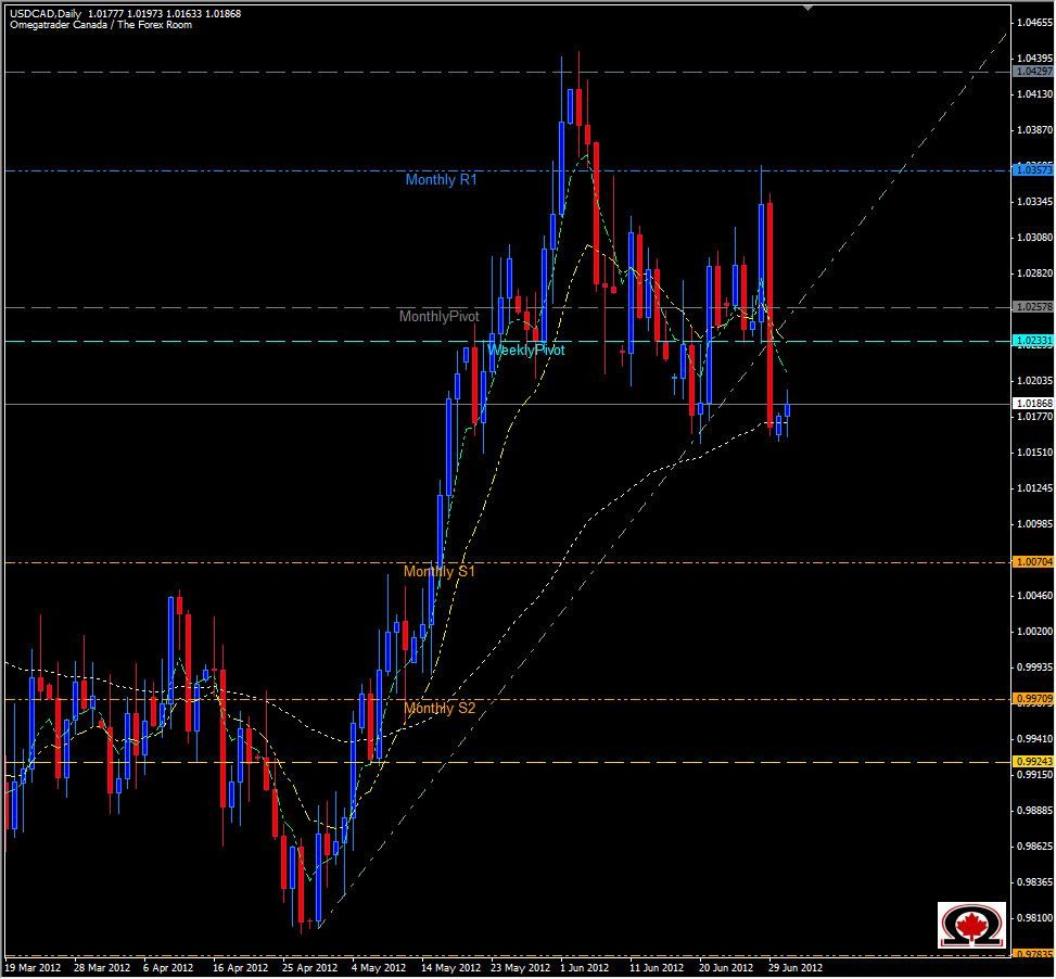 The US Dollar took a tumble last week due to slightly lower than expected economic numbers, as well as investors rushing back to the EURO after the now well known news from the EU Summit meetings. As a result, most currencies across the globe increased in value mirroring the decline in the USD. One currency to benefit from this is the Loonie, the Canadian Dollar. The Canadian Dollar rose to 1.0165 US before the market closed for the weekend, breaking an ascending trend-line on the Daily Chart and breaking Bearish out of a Bullish Flag formation on the same time frame. The pair came to a halt at the 62 EMA and has started to retrace during Asian Trading today, but it remains to be seen if the Bearish Trend will surface as the winner or if the Bulls will now resume the reigns and push the pair higher.