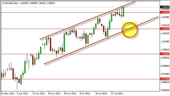 The chart looks very strong, and it should be said that the 1.05 level has finally been taken out on a daily close. This of course is very bullish, but I do see some potential for resistance ahead. This isn't based upon anything I have against the Australian dollar, quite the contrary as I believe it is one of the strongest currencies in the world right now. Rather, it is what I see from a technical standpoint that makes me believe this pair will be pulling back fairly soon.