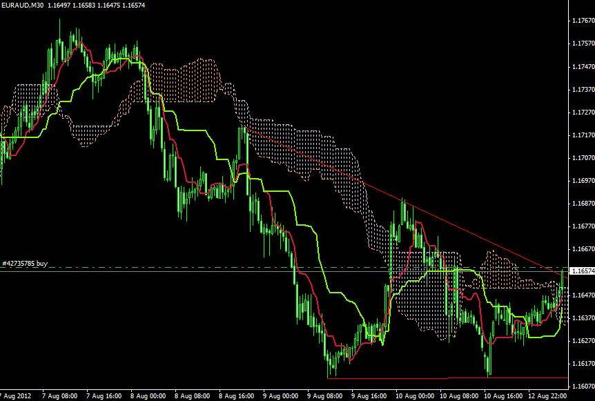Description: EUR/AUD found support at 1.1610 and formed double dip. Today the pair broke above descending trend line. The pair is trading above the kumo, Tenkan sen and Kijun sen cross is bullish as well.