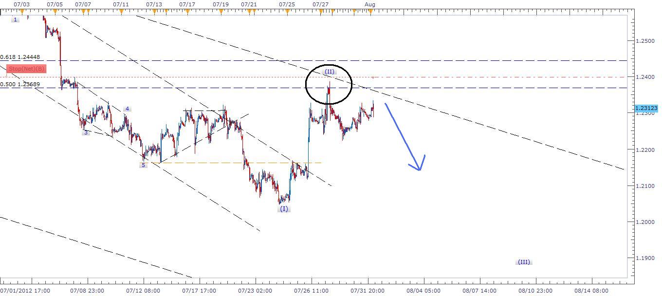 Description: High Probability Trading and Elliott wave counting, I expect wave ii of III has been engaged in the primary falling trend after a pull back. We have here two scenarios in this situation. 1) Minor wave C of a Zigzag to drop down to 1.21750 level or 2) a major five waves as of wave III to fall down below 1.21750. Now I will short Euro/Dollar and decide on next move once we meet at 1.21750 level.