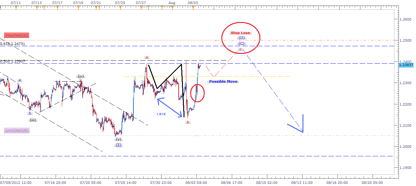 Description: To follow up on my last post dated August 3, 2012, we got caught in the middle of expanded flat wave (c) located in B correction. The trend has bounced up after hitting lower 1.618 at 1.21344. The trend is in a progress of final up move toward its (C) with a motive wave that might hit 0.618 Fibonacci level at 1.24730. In my previous trade alert, we hit the stop loss at 1.23700 in the middle of final (C) wave. However, I recommend the following to maximize the chances of making profits from this pair: