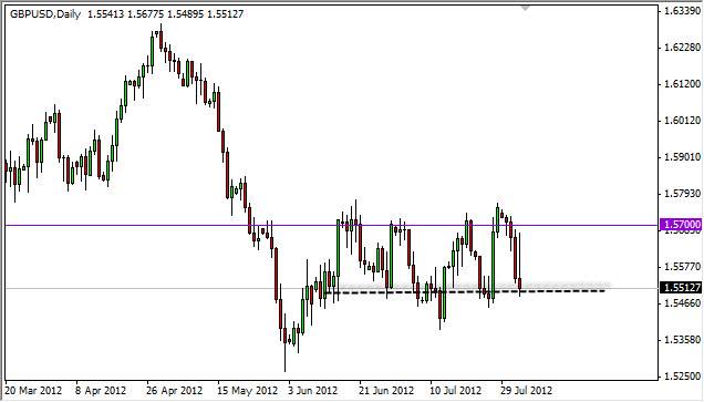 GBP/USD looks absolutely horrible at this point. Granted, we're still within the consolidation range of the end of the Thursday session, but the action for the day was very poor indeed. The fact that we initially spiked all the way to 1.57, and then it ended up at 1.55 doesn't bode well for this market going forward.