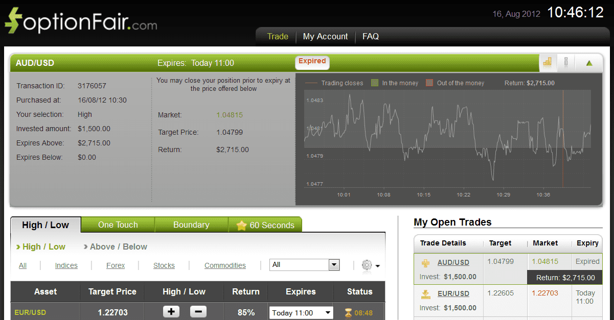 The target price for AUD/USD at the buying time (10:30) was 1.04799 for the expiration of 10:45. The Asset closed on 1.05824 and I made $1215.