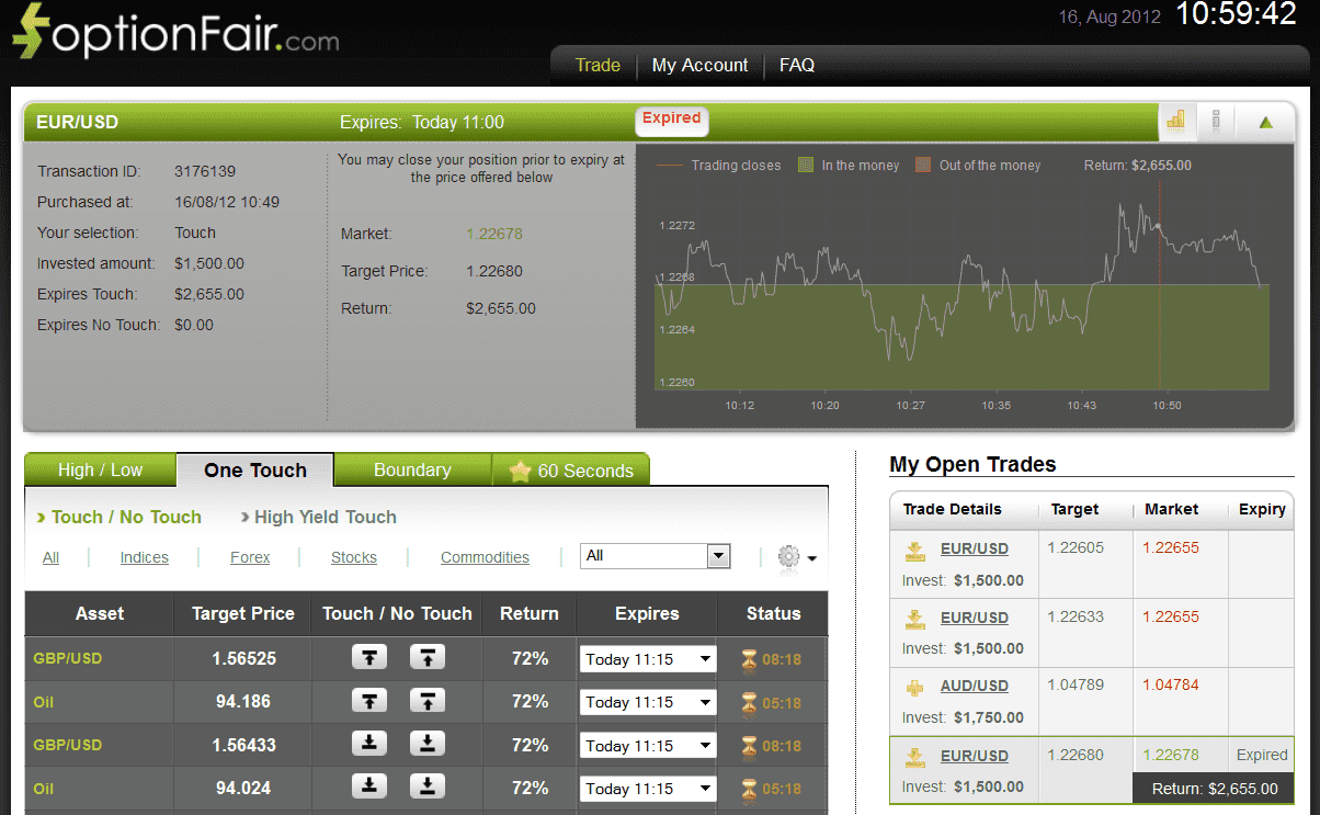 With optionFair™ binary options trading platform, I traded $1500 on the “Touch down” instrument.