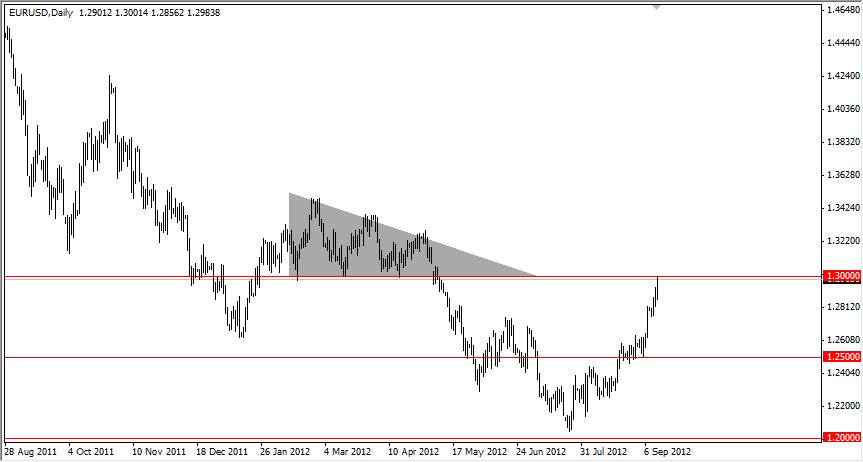 EUR/USD rose during the session on Thursday as the Federal Reserve announced an expansion of monetary easing via the Mortgage Back Securities market. The additional $40 billion that is going to be spent each month should continue to keep rates extraordinarily allow in the United States. Also, the Fed stated that they were looking at keeping rates extraordinarily low until the end of 2015, and continuing to ease until well after the economy picks back up.