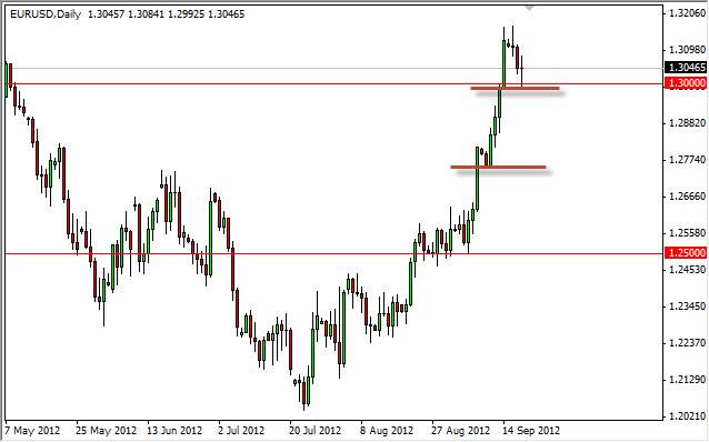 If the 1.30 doesn't hold as support, I think the 1.28 handle will be tested at that point. That area would be a much more comfy place to take a long position in the Euro from, and I would be much more willing to do so. I cannot stress enough how overbought this pair looks currently, and as such I am not willing to buying this market. Quite frankly, if I want to buy or sell the Euro, there are going to be easier currencies to match it up with.