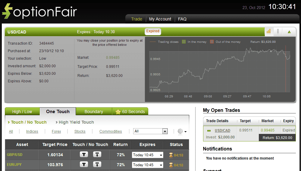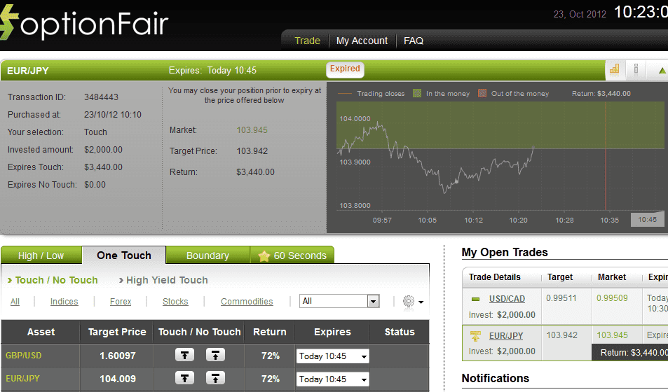 Using optionFair as my binary options trading platform, I've invested £2,000 on the “Touch” instrument due to the high return offered. The option offered a return of 72% if the option touched the strike price prior to expiration, which means that if the signal is correct, I could profit £1,440 on my investment.