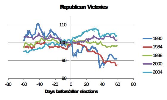 Here are the responses of XAUUSD to the various election outcomes (for the day of election, XAUUSD is normalized to 100):