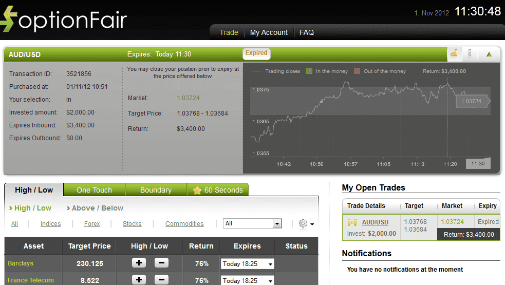 I logged in the optionFair trading platform and traded $1500 using the "High" instrument. This kind of option has a possible return of 81% if the option closes above the target price, which means that if the signal is correct I could get a return of $1215 on my investment.