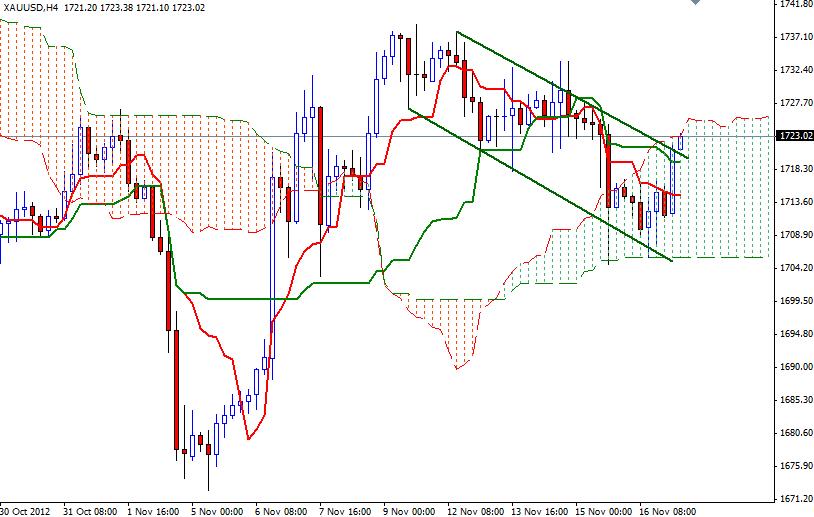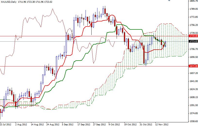 During lower volume Asian trading today gold (XAU/USD) turned bullish and is currently trading at 1723. Lately the biggest influence on the gold price is the ongoing uncertainty over the U.S. budget talks and therefore I expect the main element effecting gold prices in coming days will likely to be investors’ concern about the U.S. fiscal situation. Although the recent reports show that global gold demand fell in the third quarter, the precious metal should continue to strengthen in the longer time frame as several central banks around the world continue to ease monetary policy. On the daily time frame, XAU/USD remains trapped in the Ichimoku cloud but Tenkan-sen line (nine-period moving average, red line) is about to cross above the Kijun-sen line (twenty six-day moving average, green line), indicating the bulls are regaining strength.