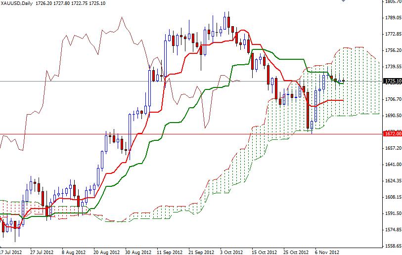 XAU/USD (gold) has been range bound since Friday. After yesterday’s choppy session, the pair looks like it is trying to wind up for a move as the range keeps getting tighter. 4-Hour chart shows the battle between the bulls and the bears intensified in the 1732 – 1720 zone. Some investors seeking to hedge against currency weakening continue to choose this precious metal to park their cash. Also developments in the Middle East increased demand for this precious metal. On the other hand, worries over Greece’s next bailout installation, uncertainty over whether Spain will seek a bailout and fears that growth in China was slowing remains supportive for the U.S. dollar. Therefore, the primary driver of gold prices in coming days looks likely to be the headlines from the United States. With this in mind, I expect CPI numbers and manufacturing data out of the U.S. today will have high impact on XAU/USD. For now the 1720 level looks supportive but 4-hour chart is turning bearish as Tenkan-sen line (nine-period moving average, red line) crossed below the Kijun-sen line (twenty six-day moving average, green line).
