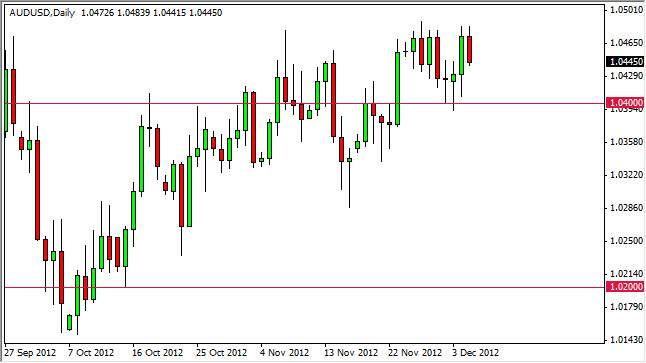The AUD/USD continues to fall every time we reach the 1.0475 level, as shown during the Wednesday trading session. Because of this, it was no surprise that we got a pullback during the Wednesday session, and as a result I think we are simply tightening up this marketplace and waiting for some type of news. What could that news be you ask? Unfortunately it is what the U.S. Congress will be doing about the fiscal cliff situation in that country.