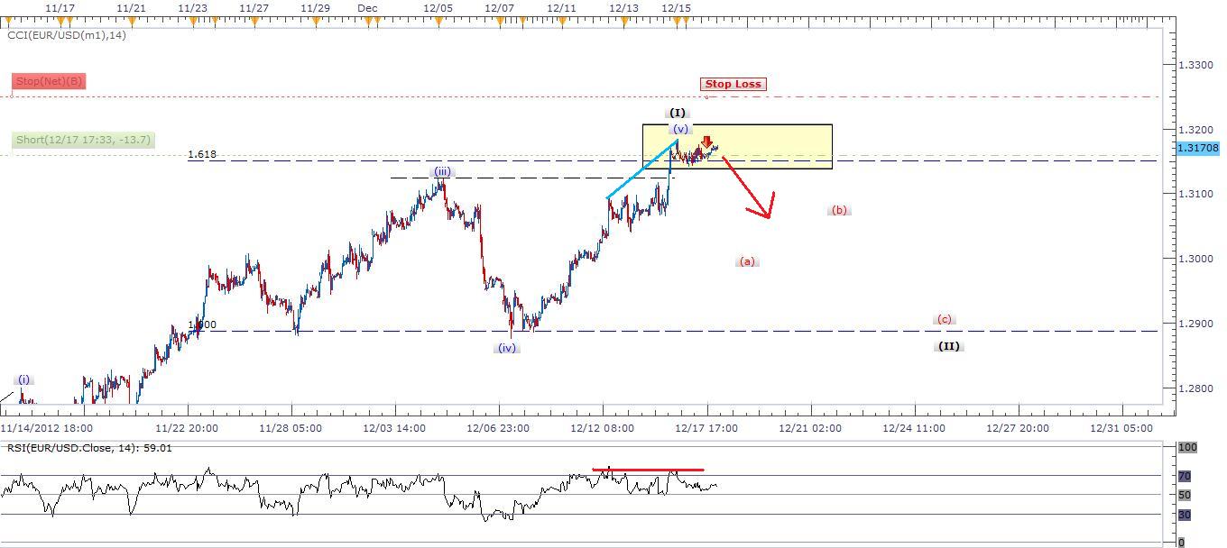 Description: I would like to start my week by selling Euro vs USD. The technical reason behind my thought that the pair is in oversold area as per Market Mass Psychology. The trend hit 1.31700 level with a divergence in RSI indicator on 5th wave to hit and pass 1.618 Fibonacci level which it should be at 1.31500. I do expect a correction on this trade cycle that might reach 1.30650 level once trend breaks. Lets watch our Stop Loss in this trade at 1.32500 and be a bit flexible with it and keep our eyes on 1.30650 as a soft target.