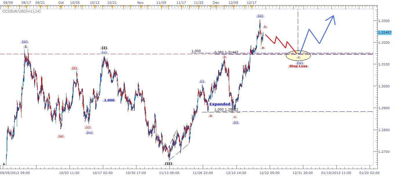 Description: Our previous Euro ESD trade hit its Stop Loss at 1.32500. I wanted to trade the very next correction wave (ii)/(iv) but the market beat us. However, After reviewing the USD chart as well as EUR/USD, I came to the conclusion that the USD is at its final barrier triangle in a larger correction patter and EUR/USD cross is progressing wave (iv) in a simple form. I would step out for sometime and watch wave (iv) testing 0.382 Fibonacci at 1.31450 to confirm wave (iv) completion and then I will post target wave (v) trade from that point traveling to expected 1.35300 level for a full cycle. Stay tuned for my next analysis.