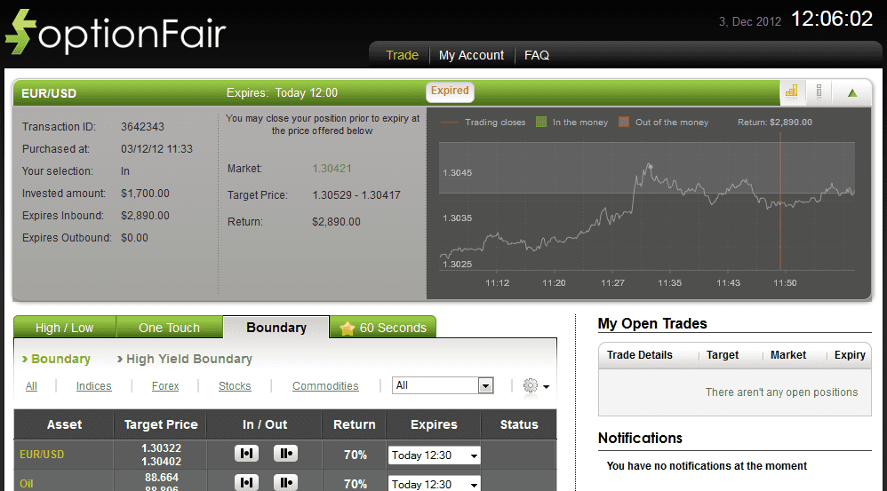 With optionFair’s trading platform, I traded $1700 on the in “Boundary” instrument. This kind of option has a return of 70% if the option will expire inside the range. That means that if the signal is correct, I could get a return of $1190 on my investment.
