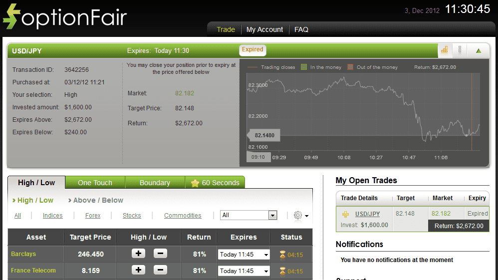 I logged onto the optionFair trading platform and traded $1600 on the "High" instrument. This kind of option has a return of 67% if the option closes above the target price, which means that if the signal is correct I could get a return of $1072 on my investment.