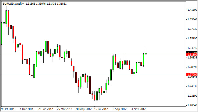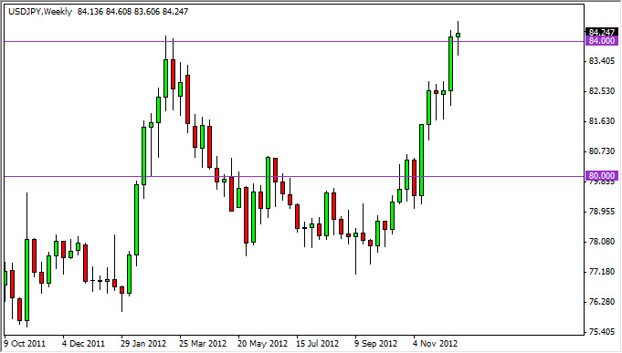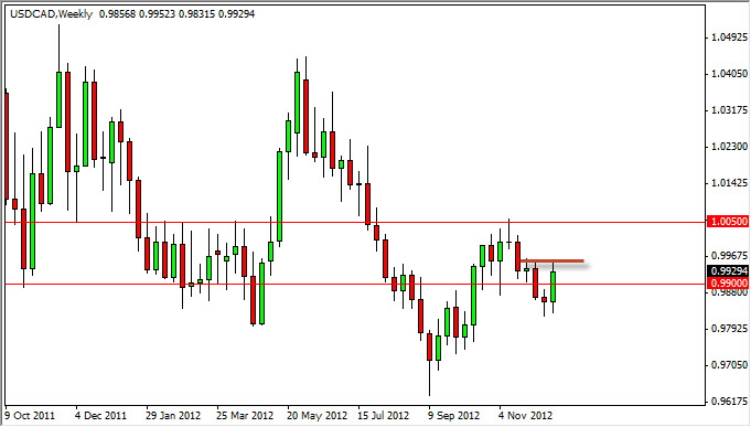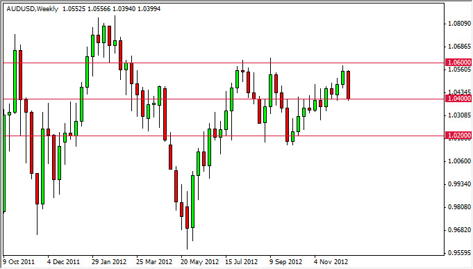 The USD/JPY pair went back and forth, and as a result this pair formed a doji. The pair has been going strong lately, and as a result I am firmly bullish of this pair. The fact that we remain above the all-important 84 handle also confirms my suspicion that we are going higher in the long run. In fact, I believe that we will see a 90 print sometime in the first half of 2013. With this in mind, I am a buyer (again) on a break of the top of this week’s candle. I would also buy a pullback to the 82.50 level.