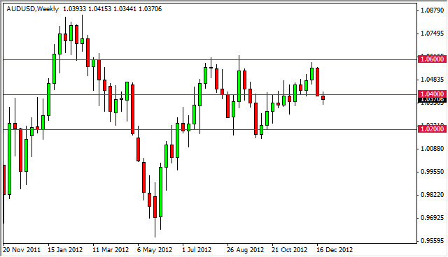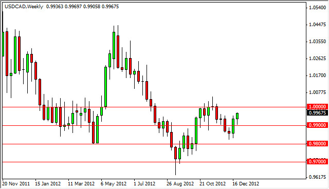 The AUD/USD pair fell slightly over the week, but continues to stay above the 1.03 level. The 1.04 level is resistive as well, and just like the EUR/USD pair – this market can’t figure out where to go at the moment. The pair is of course a risk sensitive market, and because of this I am somewhat surprised that it remains as buoyant as it is at the moment. The Aussie remains a favorite of currency traders as a proxy for risk, and because of this I think that if we finally get a resolution to the fiscal cliff in America – this pair could skyrocket. I think a move above the 1.04 level would signal that the risk is back in the market, and as a result I would be long of this market on a daily close above that level. I am not a big fan of shorting though, as I see a lot of “noise” below.
