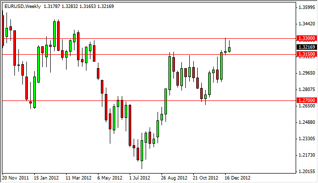 The EUR/USD pair failed to break above the 1.33 resistance level for the second week in a row this past week, and the fact that Christmas was on Tuesday certainly did little to help. The pair seems “stuck” between the 1.33 and 1.3150 levels at the moment, and with the “fiscal cliff” talks struggling in the United States, it is likely to continue to go sideways until we get some kind of resolution – or lack of.