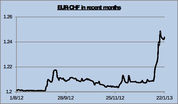 First, a reminder of the current state is in order. After a persistent appreciation in the CHF vs. the EUR from almost 1.40 prior to the Greek debt crisis outbreak to less than 1.04, the Swiss National Bank (SNB) went into action. The strengthening of the Swiss Franc (CHF) was hurting the local economy. The SNB announced that it was setting a floor on the value of the CHF at 1.2 CHF per EUR. That meant that any attempt to sell EUR-CHF will bring the SNB into the market as a buyer. With practically unlimited appetite to buy EUR, the speculative purpose of selling EUR-CHF will defeat itself as the SNB guaranteed that the price will not drop. In this manner, the SNB hoped (and succeeded) to alleviate the pressure on the CHF.