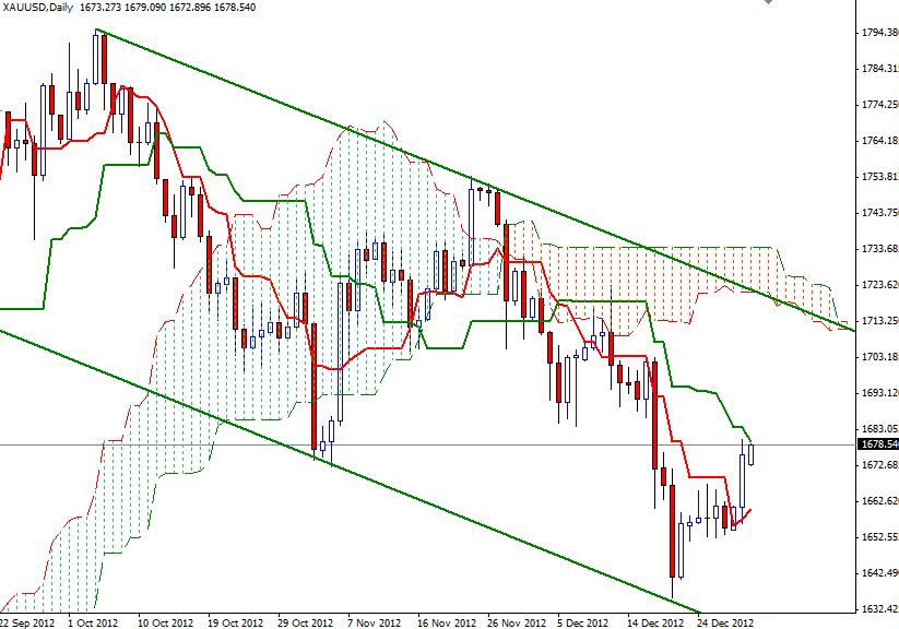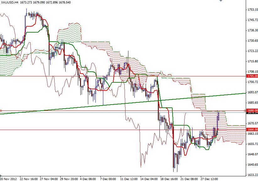 Although XAU/USD started the first trading day of 2013 lower, the pair has been climbing slowly during the Asian session. The pair traded as high as 1678.55 after the House of Representatives formally passed the fiscal cliff bill which will undo tax increases that took effect yesterday. The House passed the bill with 257-167 vote. The bill will extend income tax cuts for household income up to $450000. Investors have been hoping that the Democrats and Republicans would reach an agreement. However, there are some other serious problems which will cause new political wars. The dept ceiling and long term budget cuts will continue to remain as a big pressure on the American dollar. Short term charts remain bullish and the recent price action supports the bullish sentiment.
