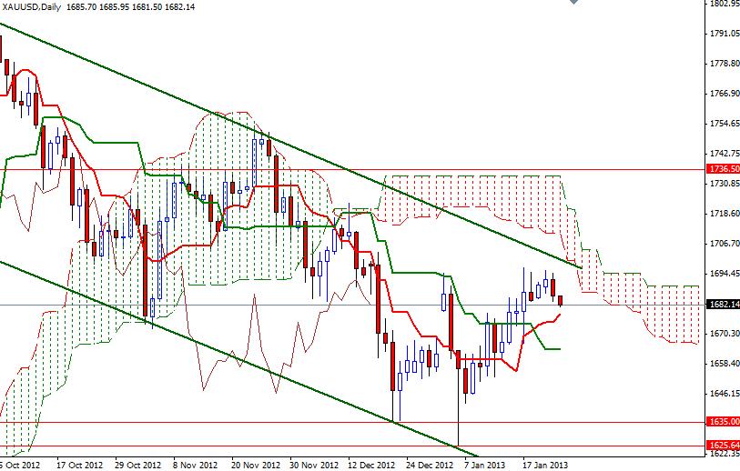 We tried to climb above the upper band of the 1685-1695 zone and didn't have enough gas. The XAU/USD pair closed lower than opening after lawmakers in the U.S. House of Representatives approved a suspension of the debt ceiling until May 19th. The House passed its plan with 285-144 vote. It seems that the debt ceiling will be out of the headlines for some time and the gold market's attention will turn to economic data releases. U.S. data released this week were not as strong as hoped but were respectable. Meanwhile the Federal Reserve's easing is going to continue as the central bank is still looking for a sustained improvement in the employment numbers and it will take some more months to see that. Although we still have a bullish picture on the 4-hour chart, gold prices continue to remain below the Ichimoku cloud and inside a descending channel on the daily time frame.