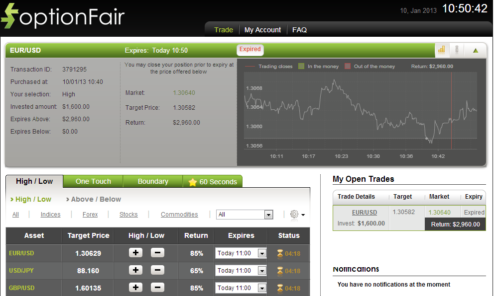 I logged onto the optionFair binary options trading platform and traded $1700 on the “Touch” instrument. This kind of option has a potential return of 70% if the option touches the strike price prior to expiry, which means that if the signal is correct, I could get a return of $1190 on my investment.