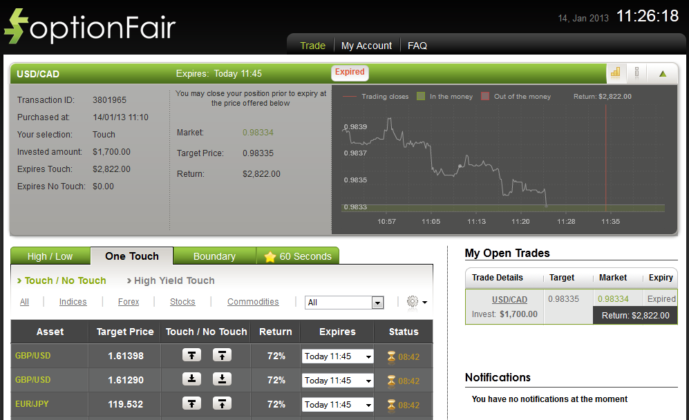 I logged onto the optionFair trading platform and traded $1700 on the "Touch" instrument, and selected down. This kind of option has a possible return of 66% if the option touches the target price prior to expiry, which means that if the signal is correct I could get a return of $1122 on my investment.