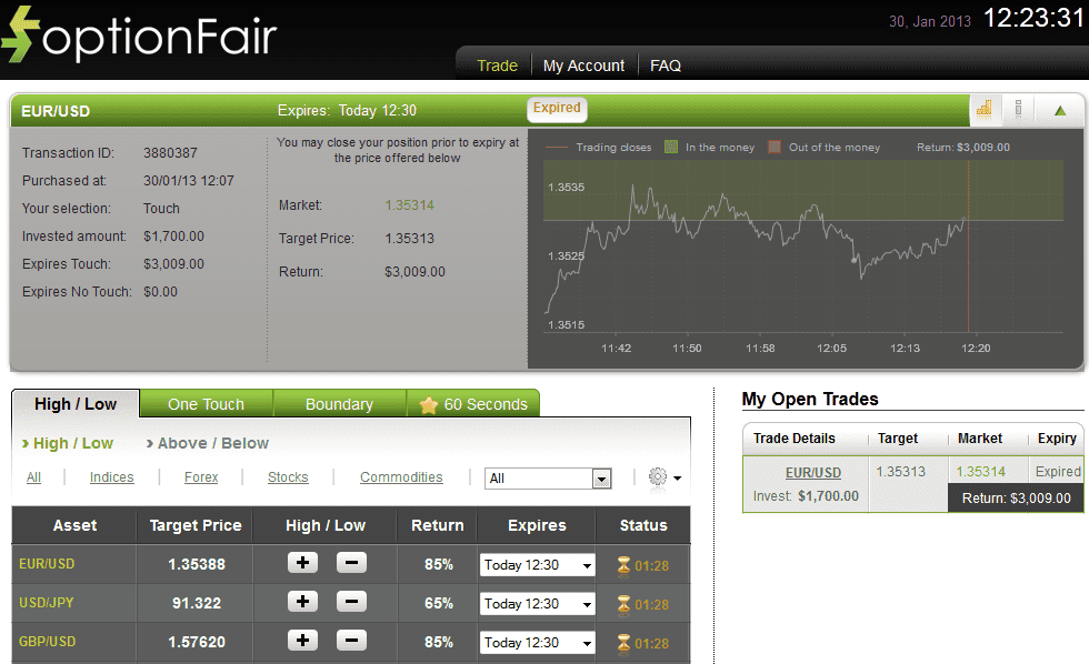 I logged onto the optionFair trading platform and traded $1700 on the “Touch” instrument. This kind of option has a possible return of 85% if the option touches the strike price prior to expiry, which means that if the signal is correct, I could get a return of $1309 on my investment.