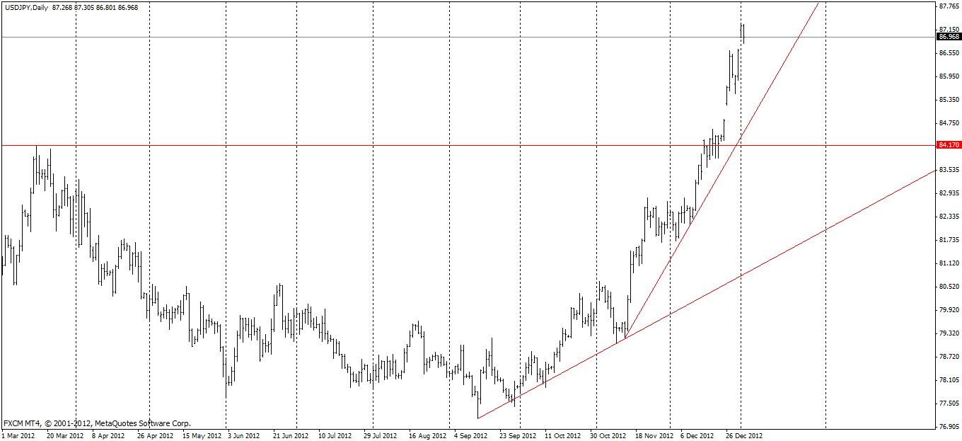 Going into 2013, the Japanese Yen continues to weaken against the USD as the newly elected Prime Minister, Shinzo Abe sends strong signals through recent statements.