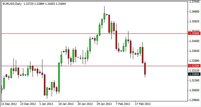 The EUR/USD pair fell significantly during the Thursday session as the 1.3250 level finally gave way. The breakdown of course was significant, but we didn't stop the 1.3150 level, which I considered to be the bottom of the "zone" of support in this general vicinity. It is because of this, that I see that we have a fairly simple set up for the Friday session.