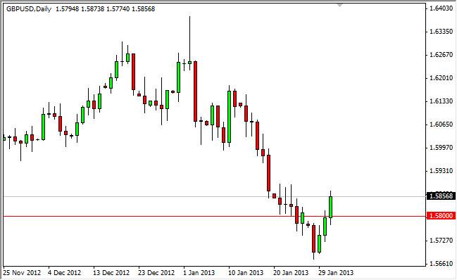 The GBP/USD pair had a strong showing on Thursday for the third day in a row. Considering how be of this pair had been recently, it is interesting to see that we are seeing quite a bit of a fight at this area. I have suggested several times before that the 1.58 level would be very crucial as to the future direction of this pair, simply because it is the top of the ascending triangle that had broken out last summer to send the market much higher.