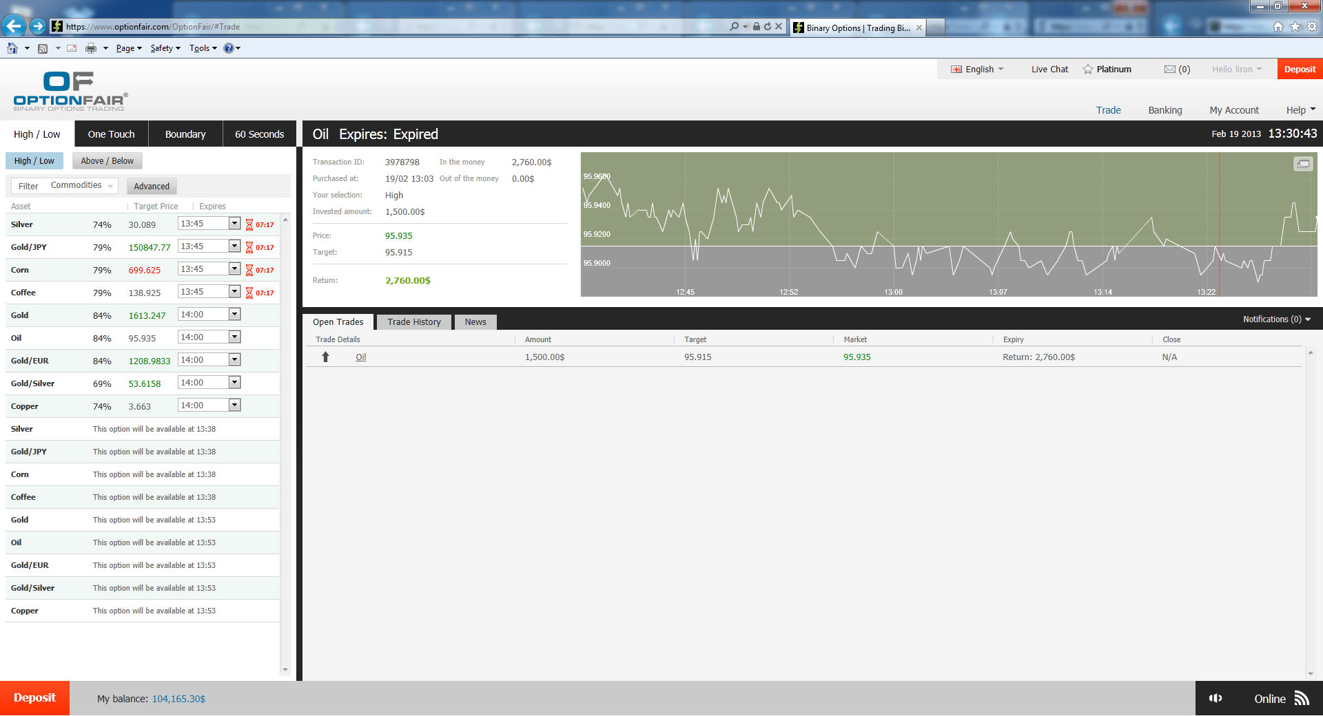 The target price for OIL at the buying time (13:04) was 95.915 for the expiry of 13:30. The asset closed at the price of 95.935 and I made $1344 in less than 30 minutes.