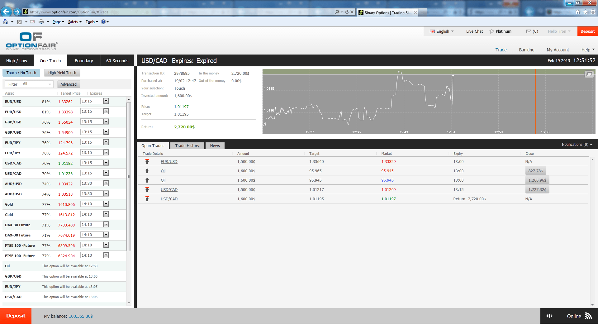 The market price for the USD/CAD at the buying time (12:30) was 1.01154 and the target price was 1.01176 for the expiration of 13:00. The asset touched my target price at 12:51 and I made $1070.