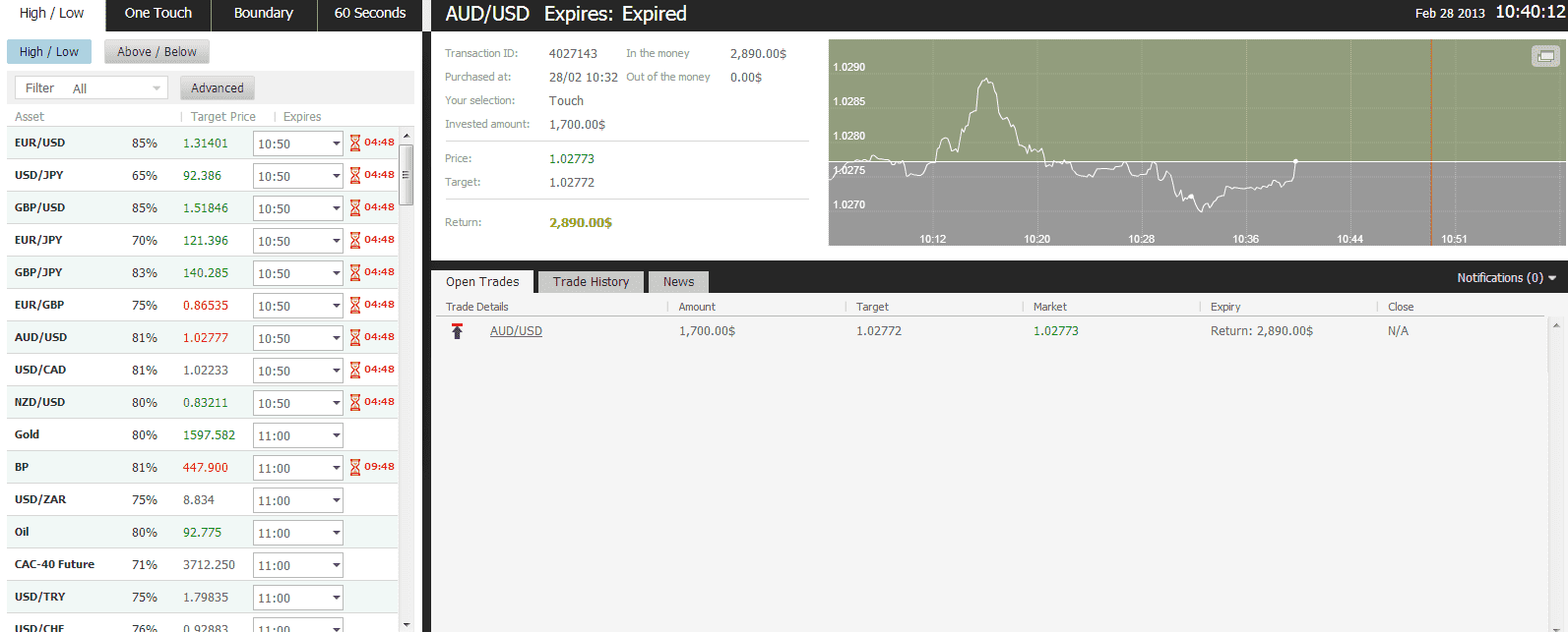 I logged in the OptionFair binary options trading platform and I traded $1700 on the “Touch” instrument. This kind of option has a potential return of 70% if the option touches the strike price prior to expiry, which means that if the signal is correct, I could get a return of $1190 on my investment.