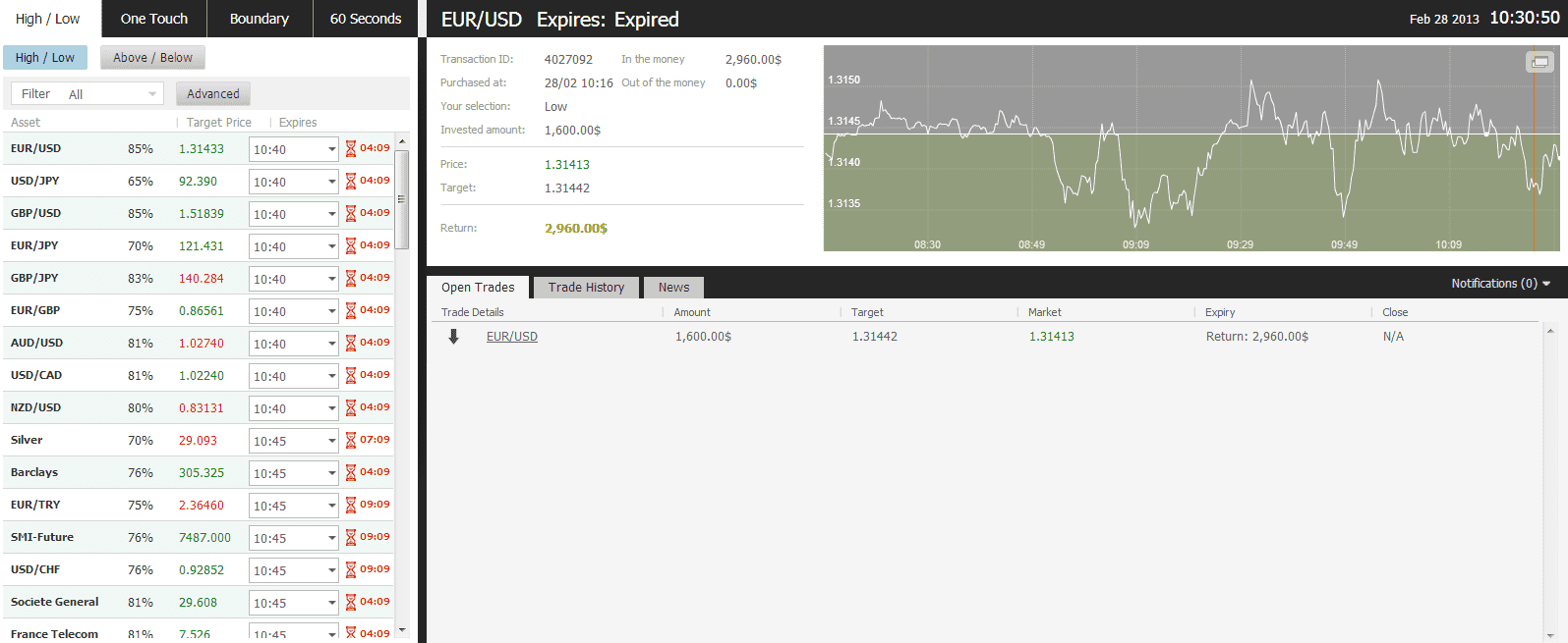 The market price for EUR/USD at the buying time (10:16) was 1.31442 for the expiry of 10:30. The asset closed on 1.31413 and I made $1360 in less than 15 minutes.
