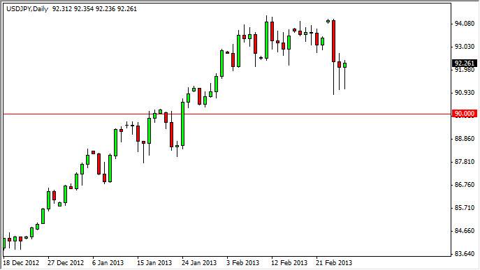 The USD/JPY pair fell again during the Wednesday trading hours, dipping below the 92 handle for the third session in a row. However, for the third session in a row we also saw the market popped back over the 92 handle and form supportive price action. When you look at the chart, you should realize that the Monday candle could be thought of as two separate trading days in some ways. In the later hours, we saw quite a bit of a bounce back in this pair, which would have formed a nice looking hammer if you would've just look at the afternoon by itself. In other words, I look at this pair is having three hammers in a row, something that is extraordinarily rare.
