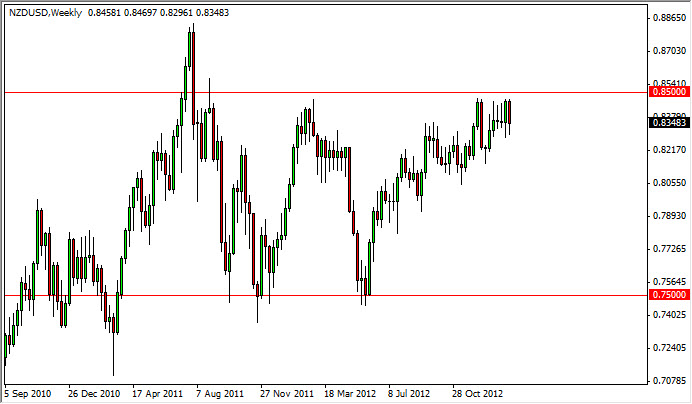 The NZD/USD pair continues to grind higher overall, but lost a bit over the past week. The pair certainly looks like it is struggling with the 0.85 level, and as a result that is the area that the market needs to break above in order to get a clear buy signal. With the recent grinding higher over the last several weeks, there is no way I can sell this pair at this point as the market has been so noisy.
