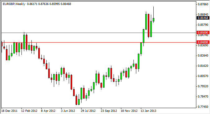 The EUR/GBP pair initially surged higher during the week and found the 0.8770 area far too strong to overcome. The Euro should by all measures be stronger than the Pound, and as a result I believe that this shooting star that formed is a very sign, but only a mild one. I personally believe that the shape of the candle signals that we may reenter the consolidation area and perhaps test the 0.8450 area for support. I also believe that area will hold, and that we will bounce from that general vicinity in order to stay within the consolidation zone overall.