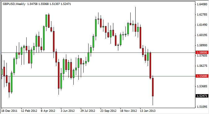 The GBP/USD pair fell significantly through the 1.5200 level during the week, which of course was the bottom of the ascending triangle that we had launched from last summer. At this point time, it looks like all hands of support are evaporated, and because of this I think this market continues lower...perhaps as low as the 1.50 level. Down there, I see a lot of support and resistance over the years, and as a result I think we will certainly find support in the general vicinity. Of note, the ratings agency Moody's downgraded the credit rating of the United Kingdom after the close of business on Friday. The market has not had a chance to react to this yet.